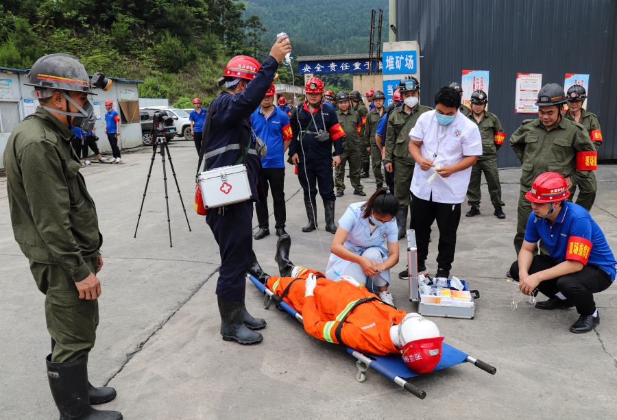 本次应急救援演练科目为片帮事故专项应急预案实战演练,模拟矿山在生产过程中,作业人员因作业场所井巷帮壁突然垮塌导致作业人员遇险,矿山负责人在接到事故报告后,立即启动矿山应急救援预案,应急救援行动按预定程序展开,在全体应急救援人员的共同努力下,成功解救遇险人员脱险。