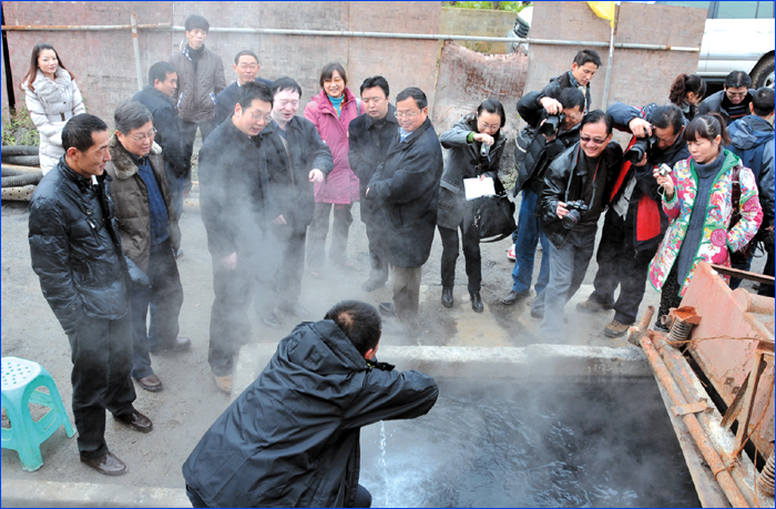 对于遵义南部忠庄片区的地热资源勘查,可谓一波三折,早在三年前,114队就集中了本单位的地质专家,对该地进行了认真细致的地质工作,大家一致认为存在地热资源的可能性非常大,于是投资500余万元进行勘探,经过半年多施工,钻进深度2600余米,由于深部地质构造的变化,结果是无功而返。但是,114队的地质专家们并不气馁,他们不甘心本队第一个自主矿权因此“消失”,于是,他们于2010年又开始了新一轮的更大范围的地质工作,邀请省内外专家进行实地勘查,更仔细的综合分析已有资料,花巨资进口物探仪器,引进国内更新的钻探工艺技术,一切准备就绪,新一轮的攻坚战于2011年2月开始,在经历了十个月的坚苦努力,一口孔深达2696.8米的深井终于完成,并达到了每天涌水量500余吨,水温达53℃的预期结果,他们以科技导航,终于使自主矿泉开花结果。