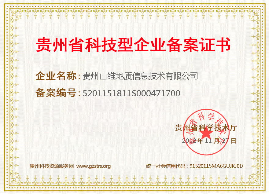 近日,贵州地矿111地质队下属企业——贵州地质工程勘察设计研究院和贵州山维地质信息技术有限公司分别获得由贵州省科技厅颁发的“贵州省科技型企业备案证书”。