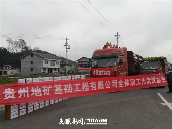 2月22日傍晚,两辆挂着“中国地大加油”“贵州地矿基础工程有限公司全体职工为武汉加油”横幅的大货车,载满53吨新鲜蔬菜和100件酒精的大货车,按响出发的号角,缓缓驶出绥阳东站,驶向中国地质大学。