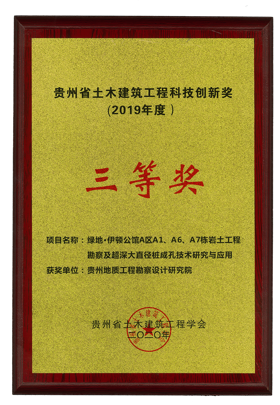 近日,从贵州省土木建筑工程学会传来喜讯,贵州省地矿局111地质大队下属企业贵州地质工程勘察设计研究院(以下简称省地勘院)申报的《绿地•伊顿公馆A区岩土工程勘察及超深大直径桩成孔技术研究与应用》荣获2019年度贵州省土木建筑工程科技创新奖三等奖。