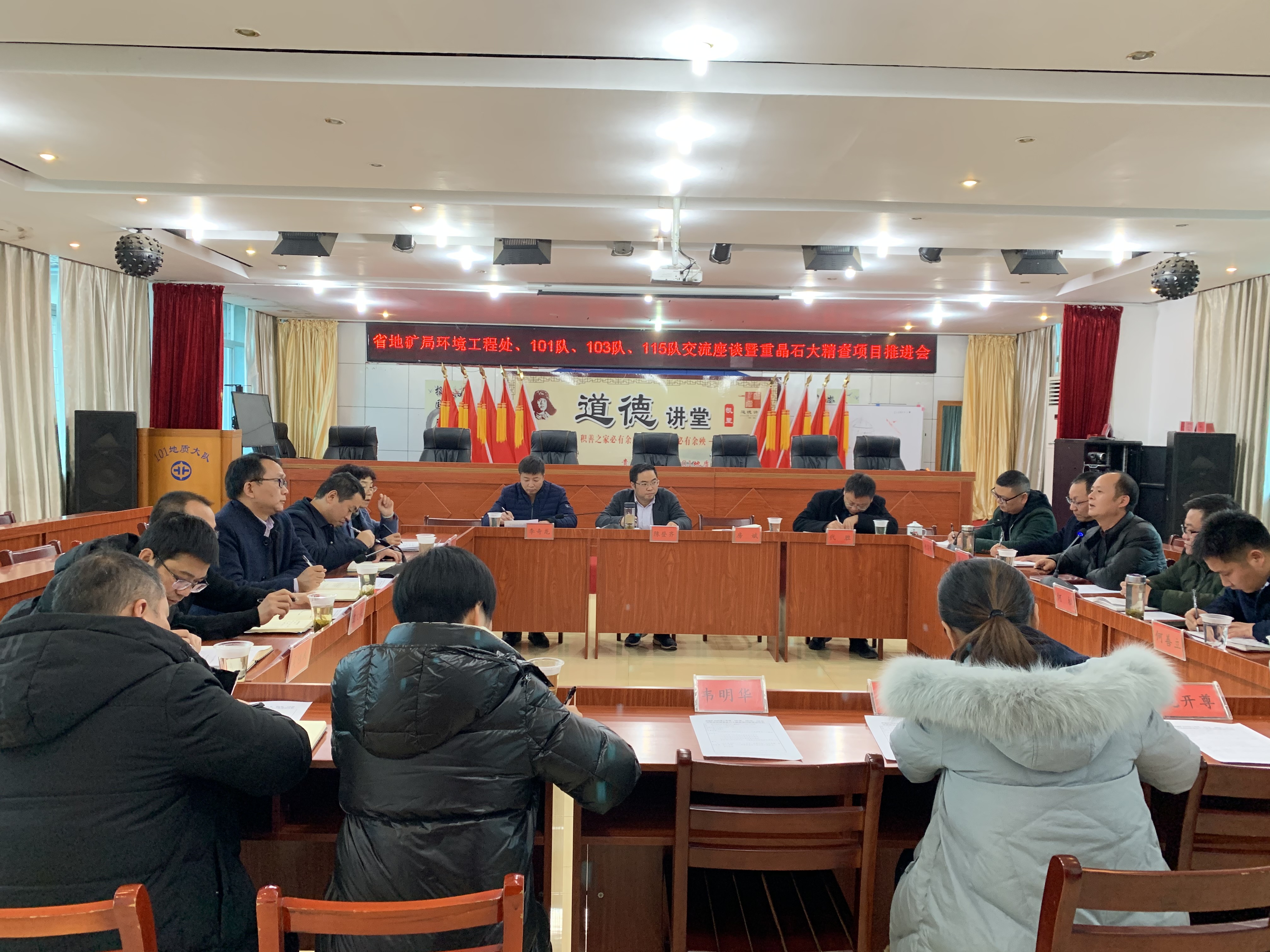 为加强技术交流,统筹推进大精查项目顺利完成。12月9日,省地矿局环工处、103地质队、115地质队到101地质队开展交流座谈暨重晶石大精查项目推进会,共23人参加会议。