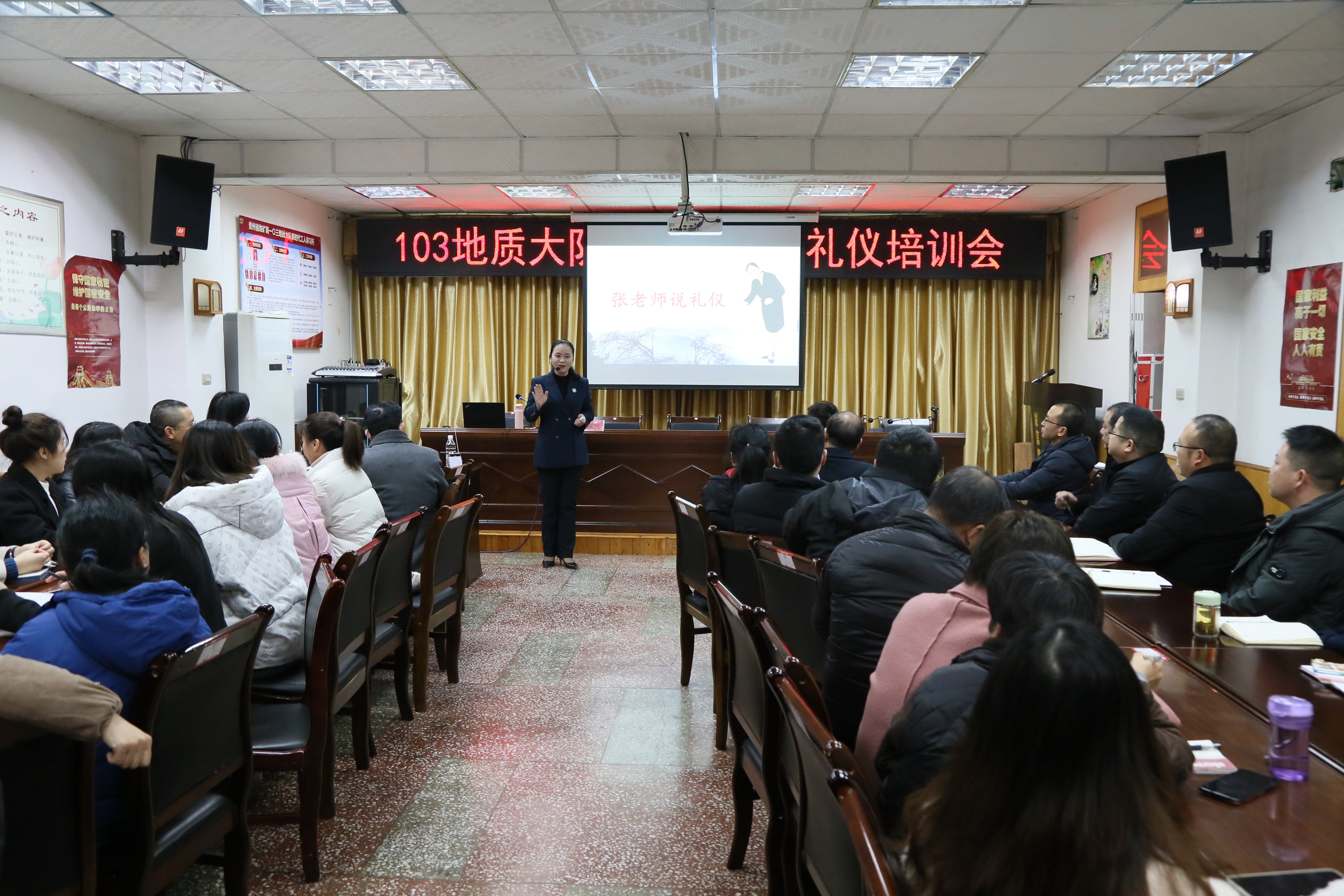 2月25日,省地矿局103地质队邀请铜仁幼儿师范高等专科学校国际教育学院院长张丽妮对全队职工开展礼仪培训。