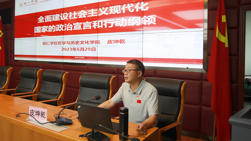 会议邀请铜仁学院哲学与历史文化学院(国学院)党委书记,中国社会科学院世界社会主义研究中心特邀研究员、中国历史唯物主义学会理事皮坤乾教授做专题培训。他以《全面建设社会主义现代化国家的政治宣言和行动纲领》为题,围绕“战略定位、大会主题、实践基础、理论指导、基本路径、根本保证、团结要求”等七个方面,从国际到国内、从过去到未来、从理论到实践,深入浅出地解读了党的二十大精神,为全院全面学习、全面把握、全面落实党的二十大精神作了系统辅导。